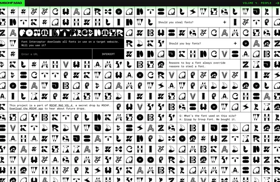 Give Font Interceptor the URL of a website, and it will identify and download all the fonts used on that site. Handy for trying stuff out.