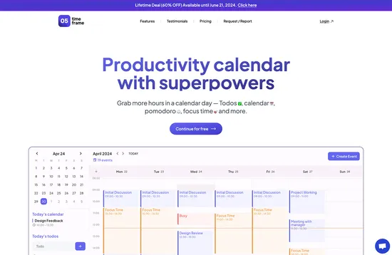 Timeframe calendar aims to boost your productivity and keep you organized by integrating todos with time blocking and task timers.