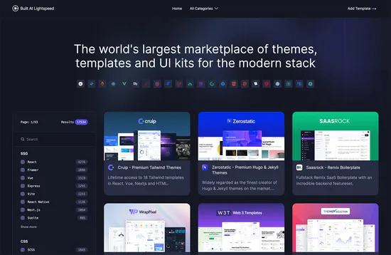 This marketplace offers themes and templates for a wide range of frameworks, including Nuxt, Gatsby, Angular, Tailwind, Vue, and Laravel. It even offers a few options for basic HTML.